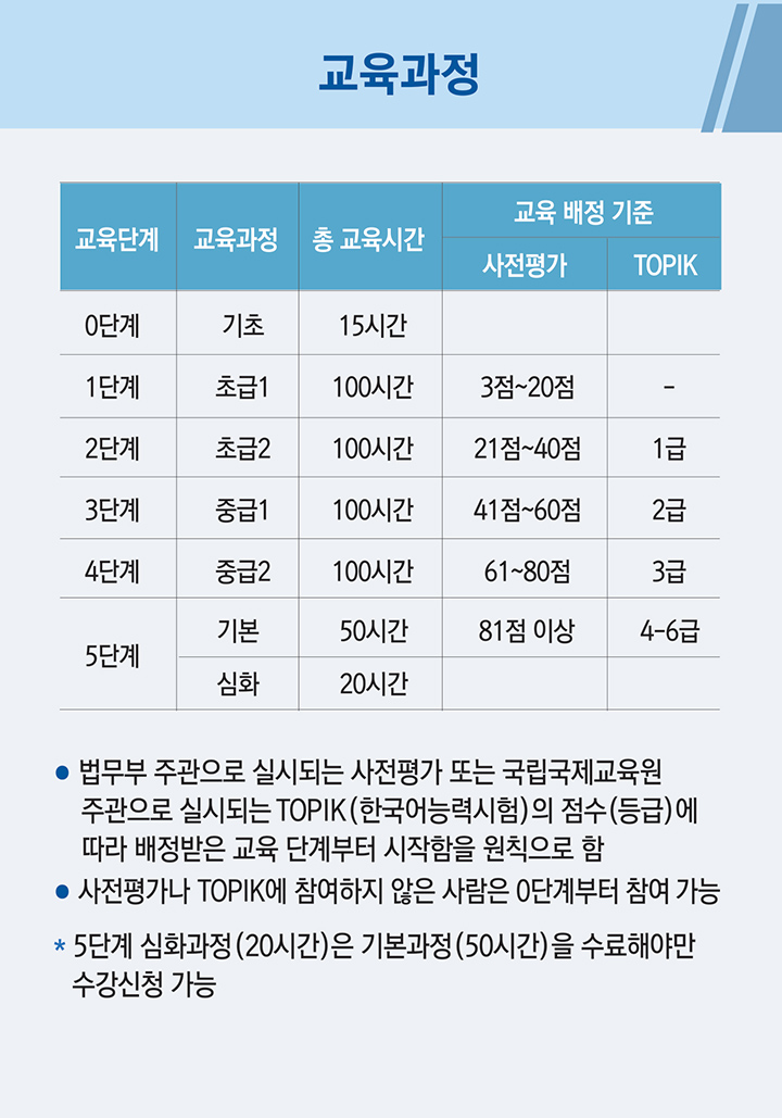 각 단계는 일정 기간 동안 진행되며, 수업을 마치면 시험을 통해 다음 단계로 이동하거나 프로그램을 완료할 수 있습니다. 이 프로그램은 외국인들이 한국 사회에 원활하게 통합되고, 더 나아가 영주권이나 국적 취득 등의 절차에 도움을 주는 중요한 수단입니다.