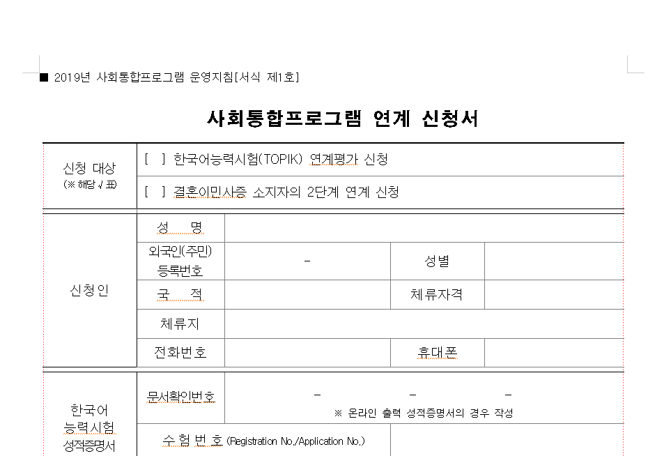 | [KIIP] 사회통합프로그램 연계 신청서 무료 다운로드 2024 (1) | 2024.05.06 |