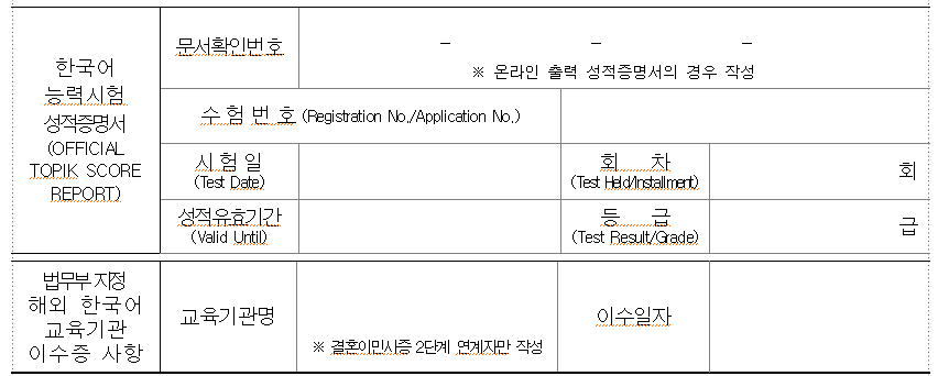 - 마지막으로 한국어능력시험성적증명서 정보들 입력해주시면 되겠습니다.