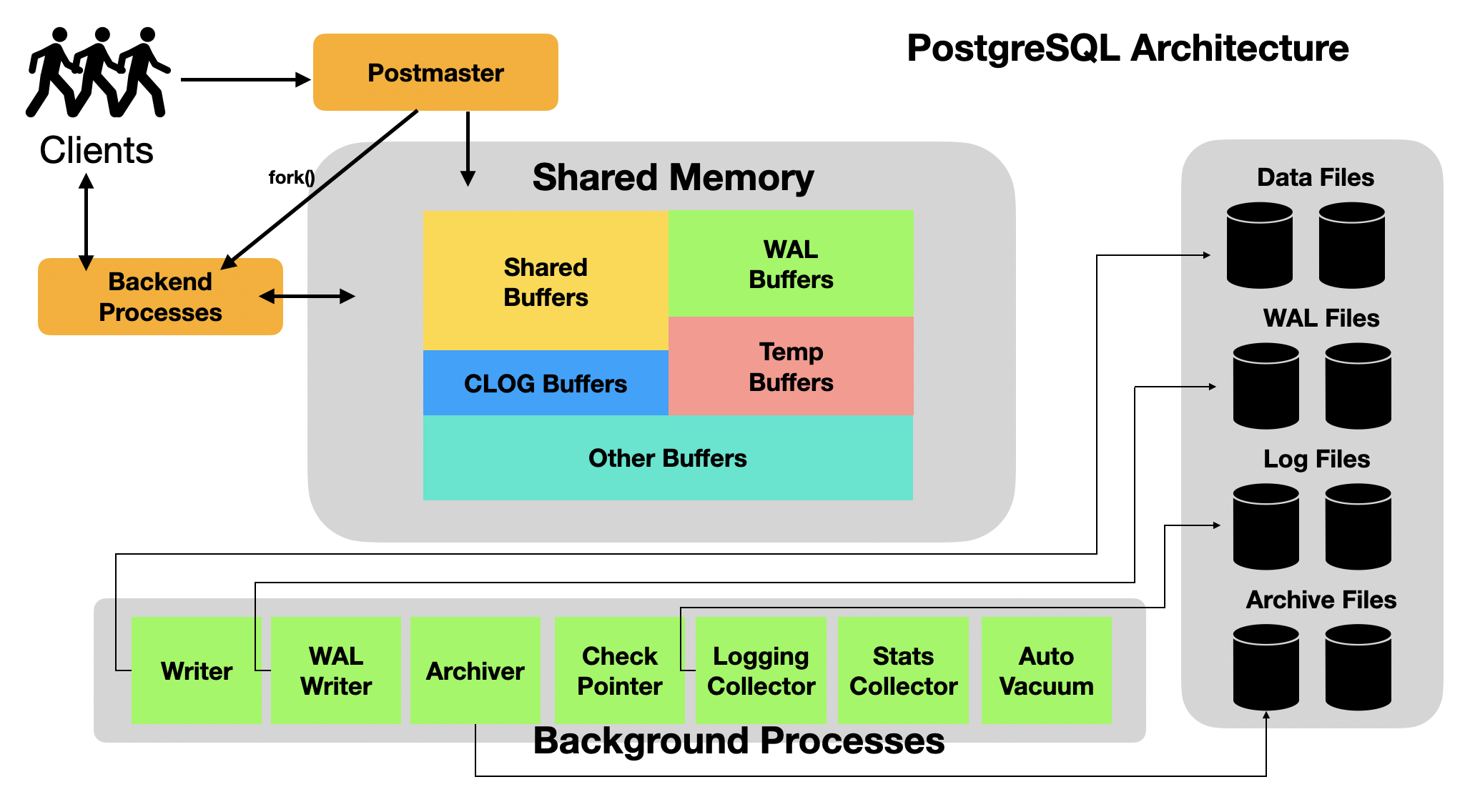 이어서 PostgreSQL의 아키텍처는 다음과 같은 주요 구성 요소로 이루어져 다음과 같습니다.