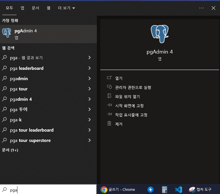 설치가 완료되면 PostgreSQL 서버를 실행합니다. 컴푸터 검색장으로 ' pgAdmin 4' 이라고 검색후 프로그램을 실행합합니다. 대부분의 운영 체제에서는 서비스로 설치된 PostgreSQL 서버를 자동으로 시작합니다.