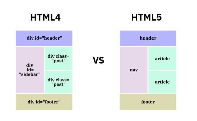 HTML5 => <header>, <nav>, <section>, <article>, <footer> 등 새로운 구조적 요소를 도입하여 페이지의 구조를 더 명확하게 정의.